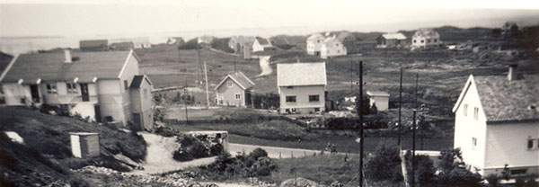 Årabrotsvegen i midten, bak, viser helling og drenering bort fra dagens husnummer 12.