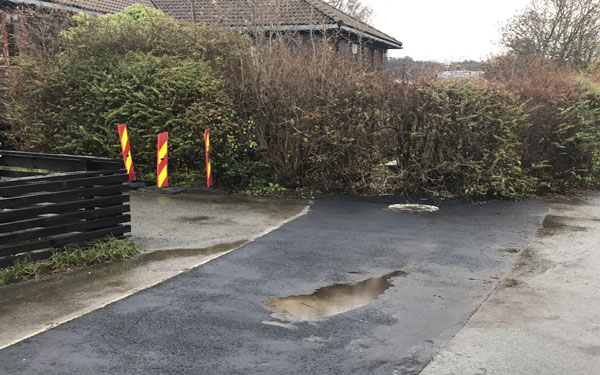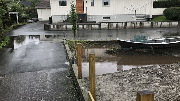Årabrotsvegen i midten, bak, viser helling og drenering bort fra dagens husnummer 12.